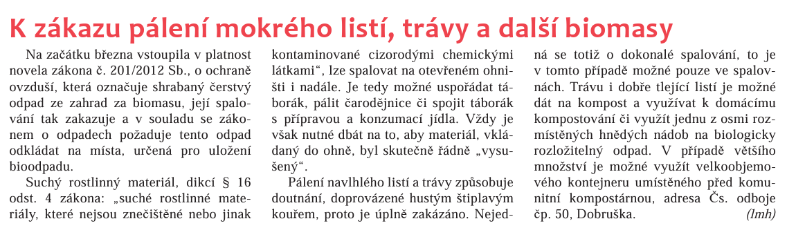 Dobrušský zpravodaj 4/2005 uvádí na straně 6 přiložené vysvětlení zákazu pálení odpadu ze zahrad.